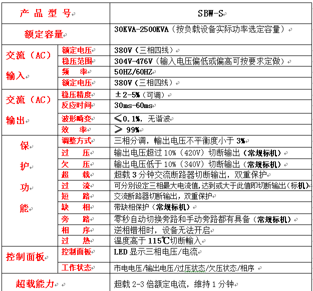 SBW-S智能数控式稳压器集先进的组合绕组补偿调压方式交流稳压技术于一体,具有高效、节能、快速调节、无噪声、三相自动平衡、无机械故障和无碳刷磨损等优点,并具有过压、欠压、缺相,过流报警、短路、过热保护等完善的保护功能,大大提高了系统运行的可靠性。该机实行数字式真实有效值采样、LCD大屏液晶面板显示,稳压精度高,响应速度快,抗负载冲击能力强,能够持续循环运行,亦可增加隔离变压器抑制各种电源干扰,轻松实现稳压变压一体化。